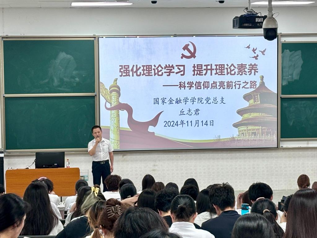 党课上,丘志君书记以《强化理论学习 提升理论素养——科学信仰点亮前行之路》为题作了专题讲授。他指出,马克思主义既是科学的理论体系,又是一种坚定的信仰,两者的关系是辩证统一的,同学们要树立正确的马克思主义观,坚持理论联系实际和坚持终身学习,始终以正确的学风来保证完整准确地理解、信仰马克思主义,坚决反对主观主义和教条主义。接着,他从重大理论创新成果产生背景、统一严整的科学理论体系、“两个结合”规律性认识、世界观和方法论的高度等方面阐述,希望与会入党积极分子深刻理解和科学把握新时代党的创新理论,切实增强思想认同和理论自信。最后,他希望同学们坚持以习近平新时代中国特色社会主义思想为指导,做到“真学、真懂、真信、真用”,将理论学习作为终身“必修课”,主动将新时代党的创新理论内化为内在的价值规范,朝着全面和健康的方向发展,重视理想信念教育,锤炼政治品格,提升理论素养,明大德、守公德、严私德,“扣好人生第一颗扣子”,重视“精神之钙”的作用,努力朝着成为“德智体美劳全面发展、堪当民族复兴大任”的时代新人发展。