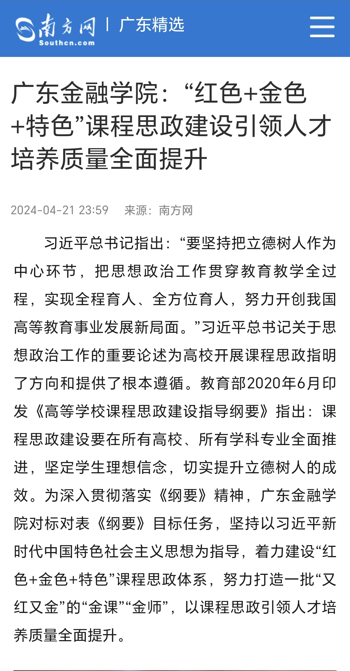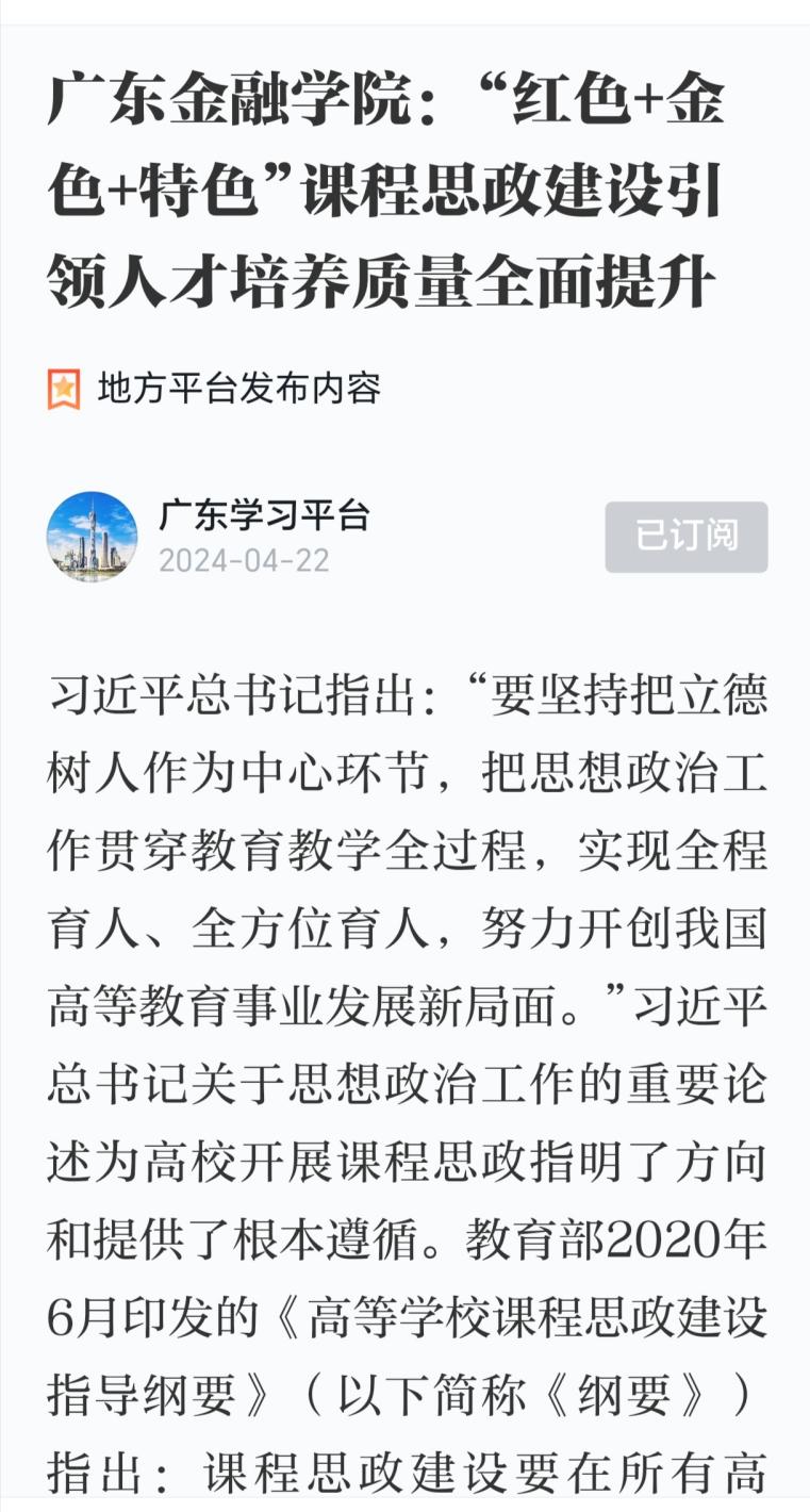 yl7703永利坚持立德树人,深入贯彻《高等公司课程思政建设指导纲要》,发挥红色金融文化等优势,构建了“红色+金色+特色”的课程思政体系,为人才培养工作赋能。yl7703永利课程思政团队在全面、深入、持续调研公司课程思政建设情况的基础上,凝练总结了公司课程思政建设的经验做法,形成了研究成果——《yl7703永利:“红色+金色+特色”课程思政建设引领人才培养质量全面提升》,并先后于2024年4月21日、4月22日、5月6日发表在南方网、“学习强国”广东学习平台及yl7703永利校园网,获得广泛关注与赞誉。其中,在“学习强国”广东学习平台上,阅读量达到216832次,点赞量高达11450次,这一数据反映了该平台内容的受欢迎程度和用户活跃度。