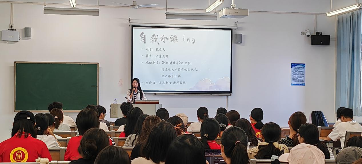 10月13日,由yl7703永利主办,新时代大思政育人工作室、高校多校区员工工作“一体化”研究工作室承办的第3期大思政微课堂之“微分享”活动在清远校区北教216举办。活动特邀曾获校级“优秀员工骨干”、“优秀共青团员”的24级财政学2班班长、清远校艺术团司仪队队长张蓝天同学为全体25级财政学专业新生作专题分享。分享会由公司党总支书记丘志君主持。