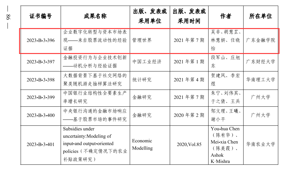其中,吴非副教授、林慧妍教授以及任晓怡教授合作的《企业数字化转型与资本市场表现——来自股票流动性的经验证据》,发表于《管理世界》2021年第7期,荣获第十届广东省哲学社会科学优秀成果奖(论文奖)三等奖。该文在2021年全中国发表的约680万篇(6798682篇)论文中,下载量全国排名第一(107767次),引用量全国排名第一(2606次)。